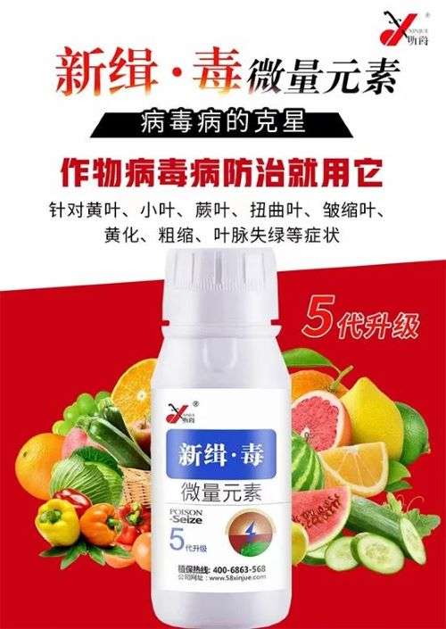 市面上的部分药剂以老化,而且农作物对部分药剂也产生了严重的抗性,建议使用新型的病毒病防治药剂:新缉·毒,本品是水溶肥厂家昕爵集团采用植物提取物与多种元素螯合而成。针对作物黄叶、小叶、蕨叶、扭曲叶、皱缩叶、黄化、粗缩、叶脉失绿等症状有良好的恢复作用。需要注意的是,病毒病应以防为主,综合防治。在通常情况下,若病毒病不严重,防治2-3次即可,但若病情严重并且环境条件又不利于蔬菜生长时,要根据情况出具体方案进行治疗。同时一定注意苗期都要开始做好预防工作,整个期间用新缉·毒3-4次,基本不会在发生病毒病。